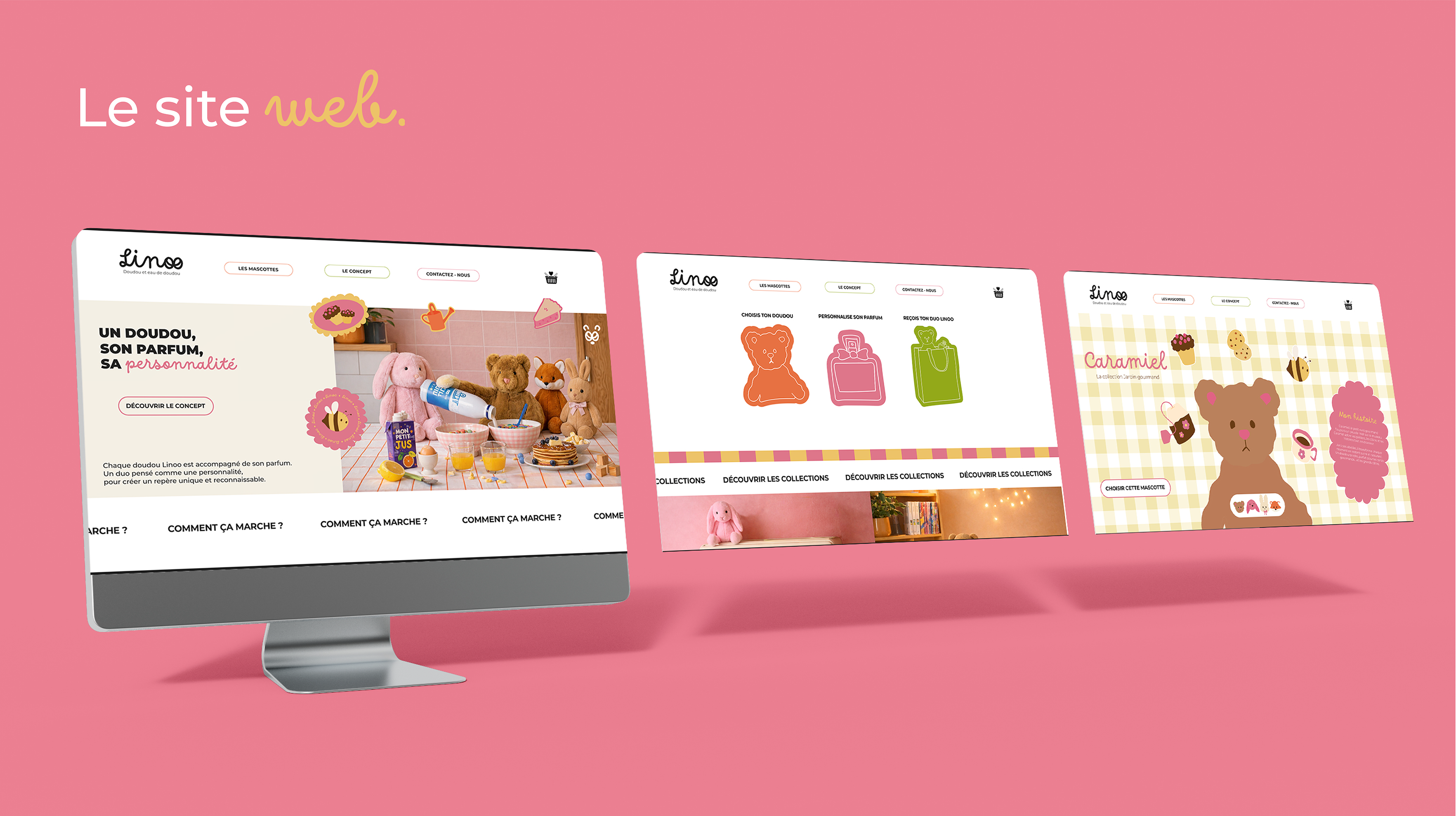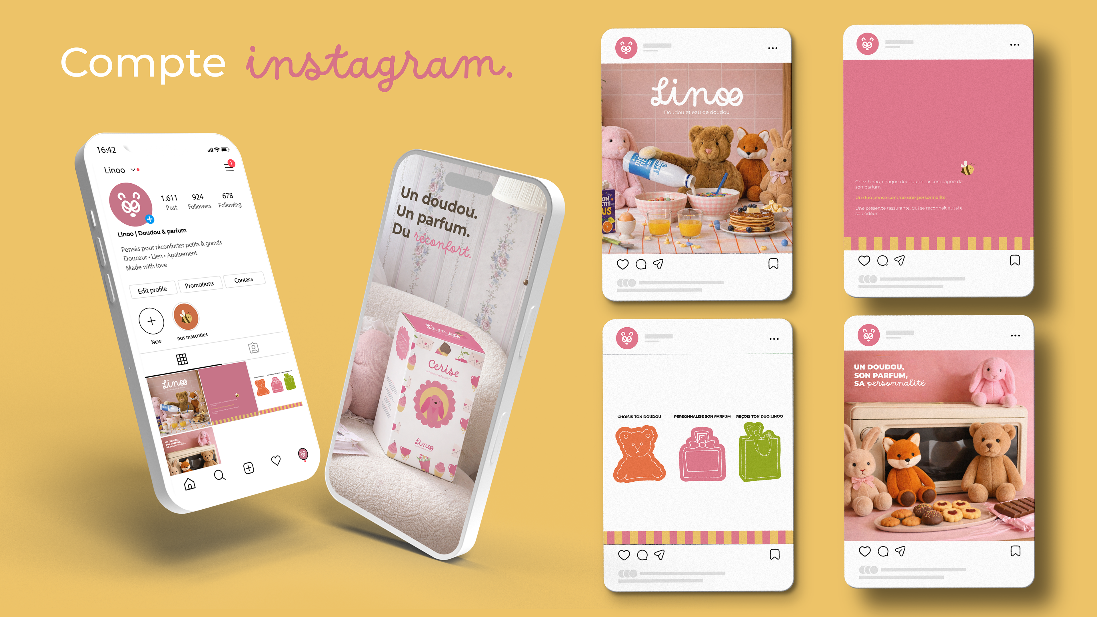 Linoo est un projet de direction artistique que j’ai entièrement conçu, de l’idée initiale à l’univers visuel final. Le projet s’articule autour du doudou et de l’eau de doudou, en explorant la notion de réconfort et de mémoire olfactive liée à l’enfance.